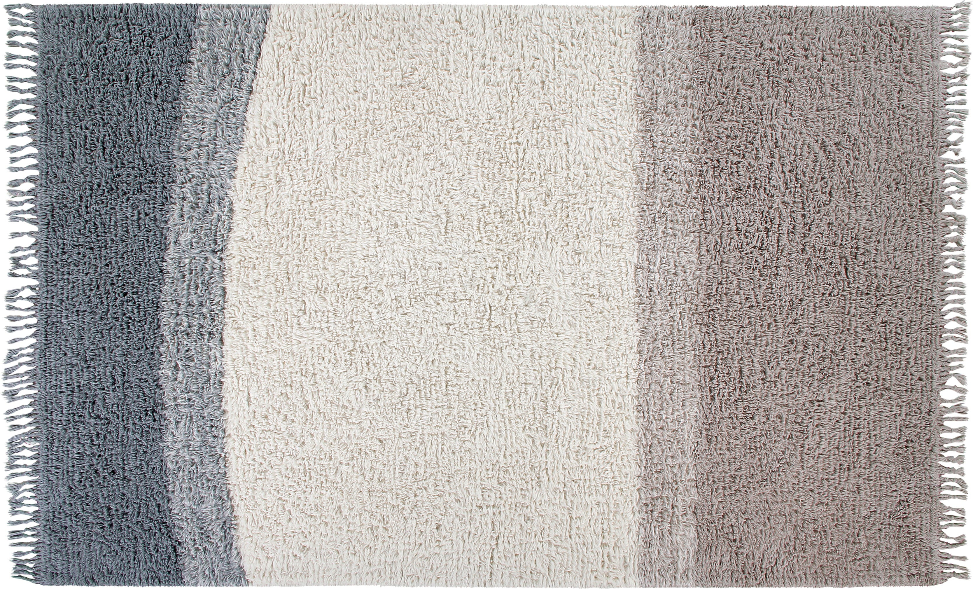 Der von Hand geknüpfte Teppich aus reiner, weicher Wolle sorgt mit seinem dezent-zurückhaltenden Design in wunderbar soften Farbtönen für behagliche Gemütlichkeit. Die kunstvoll über kreuz geknüpften Fransen an den Rändern verleihen ihm ein attraktives & dekoratives Finish. Ein stilvoller Eyecatcher in modern-puristischem Look, der sich in allen Wohnräumen zuhause fühlt.